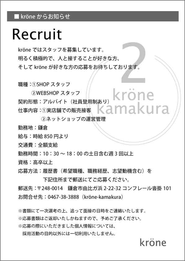 kroneよりスタッフ募集のお知らせです。