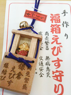 箱がスライド式になっていて、 それを開けると鯛を持ったえびす様登場。 雑貨心をくすぐるお守りですよね。可愛い。 (このお守りは結構喜ばれます。鎌倉に来たときにはぜひ。)